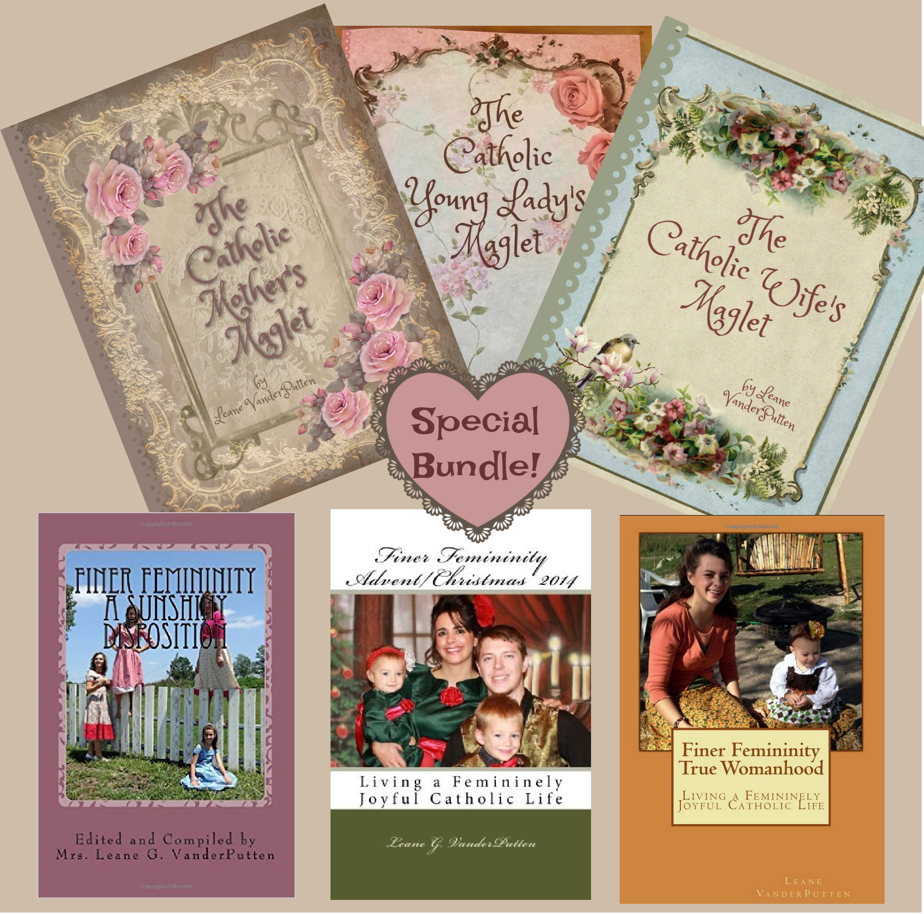 Finer Femininity is a small publication compiled to inspire Catholic women in their vocations. It consists of uplifting articles from authors with traditional values, with many of them from priests, written over 50 years ago. These anecdotes are timeless but, with the fast-paced “progress “of today’s world, the pearls within the articles are rarely meditated upon. This little magazine offers Catholic womankind support and inspiration as they travel that oftentimes lonely trail….the narrow road to heaven. The thoughts within the pages will enlighten us to regard the frequently monotonous path of our “daily duties” as the beautiful road to sanctity. Feminine souls need this kind of information to continue to “fight the good fight” in a world that has opposing values and seldom offers any kind of support to these courageous women. Inside the pages you will find inspiration for your roles as single women, as wives and as mothers. In between the thought-provoking articles, the pages are sprinkled with pictures, quotes and maybe even a recipe or two…